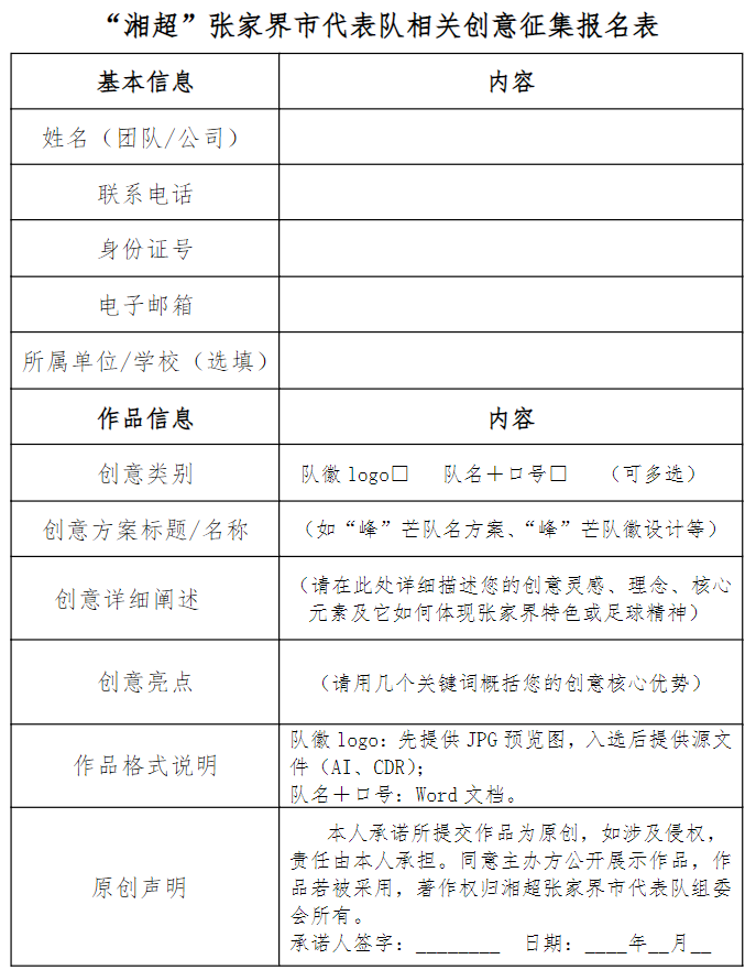 2、作品须原创无版权纠纷,作品一经采用,其著作权等知识产权即永久无偿归征集方(湘超张家界市代表队组委会)所有,征集单位享有一切使用权。